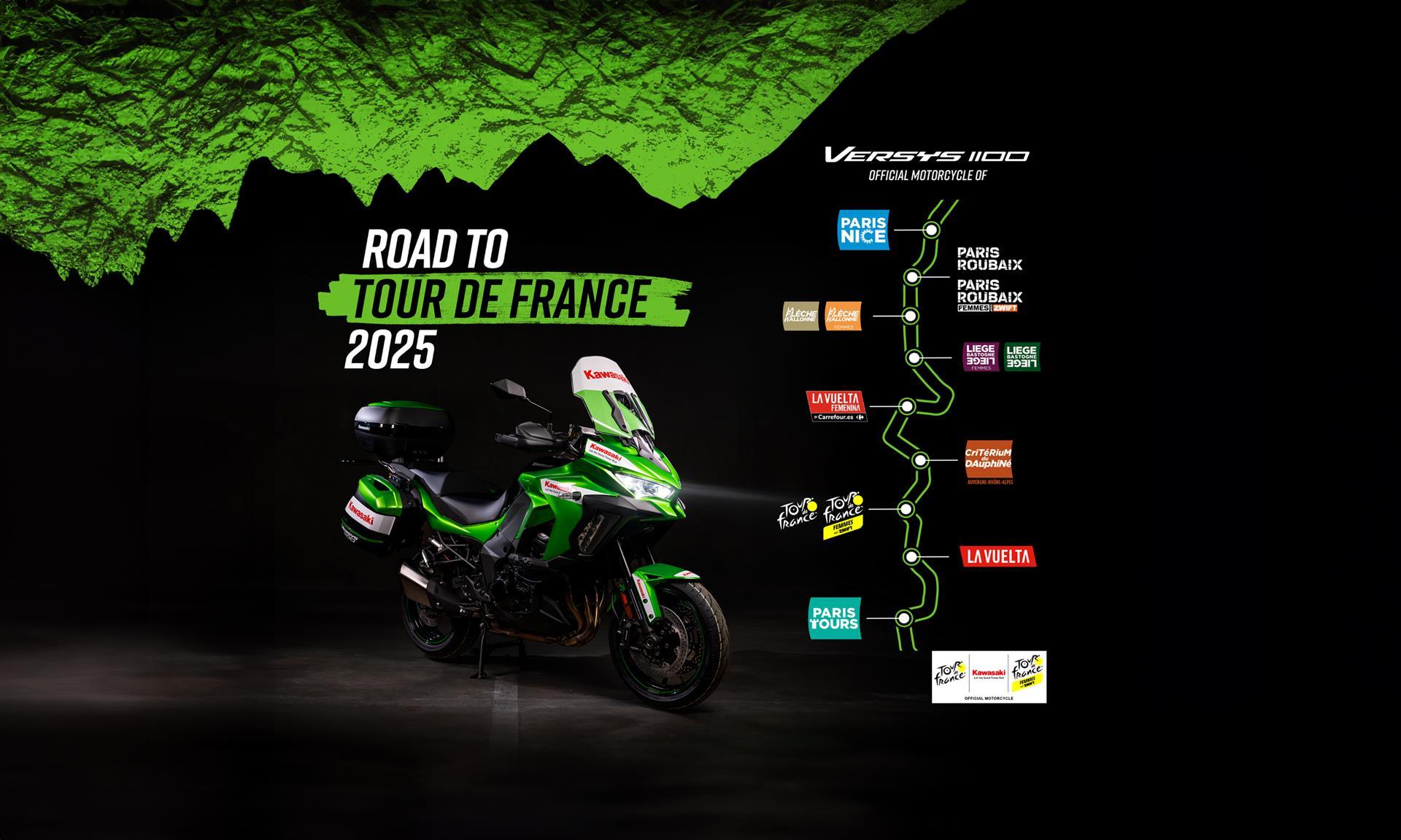 La nouvelle Versys 1100 2025 a été sélectionnée comme machine officielle pour la première année de ce partenariat. Ce partenariat marque le renouvellement de l'engagement de Kawasaki envers la plus célèbre course cycliste au monde, une relation qui remonte au milieu des années 1980, lorsque des modèles comme la GTR1000 et, plus récemment, la 1400GTR jouaient un rôle clé.